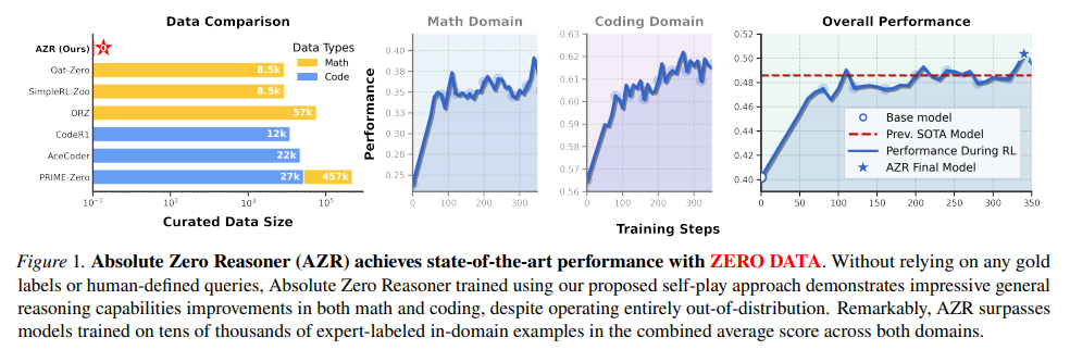 검증 가능한 reward source를 활용하여 개방적이면서도 근거 있는 학습을 유도하는 시스템인 "Absolute Zero Reasoner (AZR)"도 소개합니다.