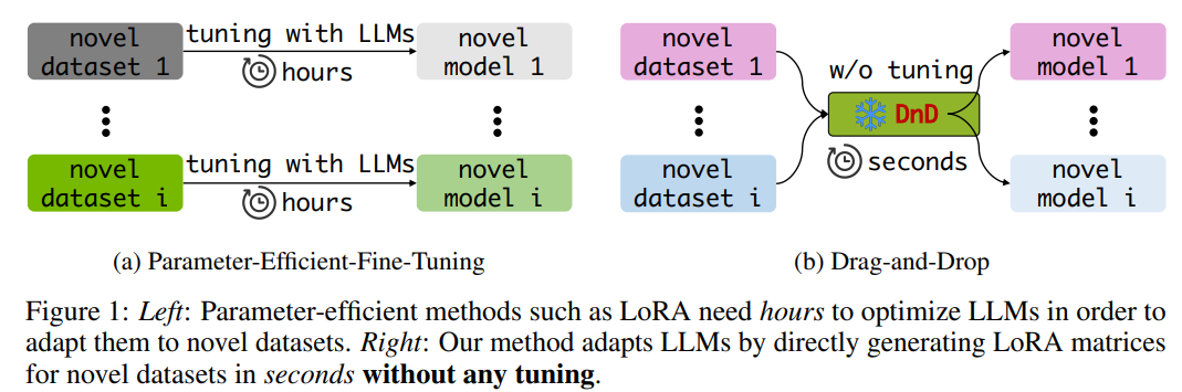 제안하는 새로운 방법인 "Drag-and-Drop"은 어떤 튜닝 과정도 없이 직접 LoRA 매트릭스를 생성하여 몇 초 만에 LLM을 새로운 데이터셋에 적응시킨다는 것을 보여줍니다.