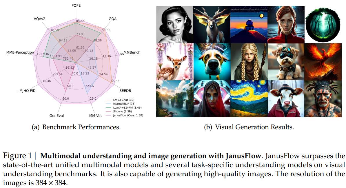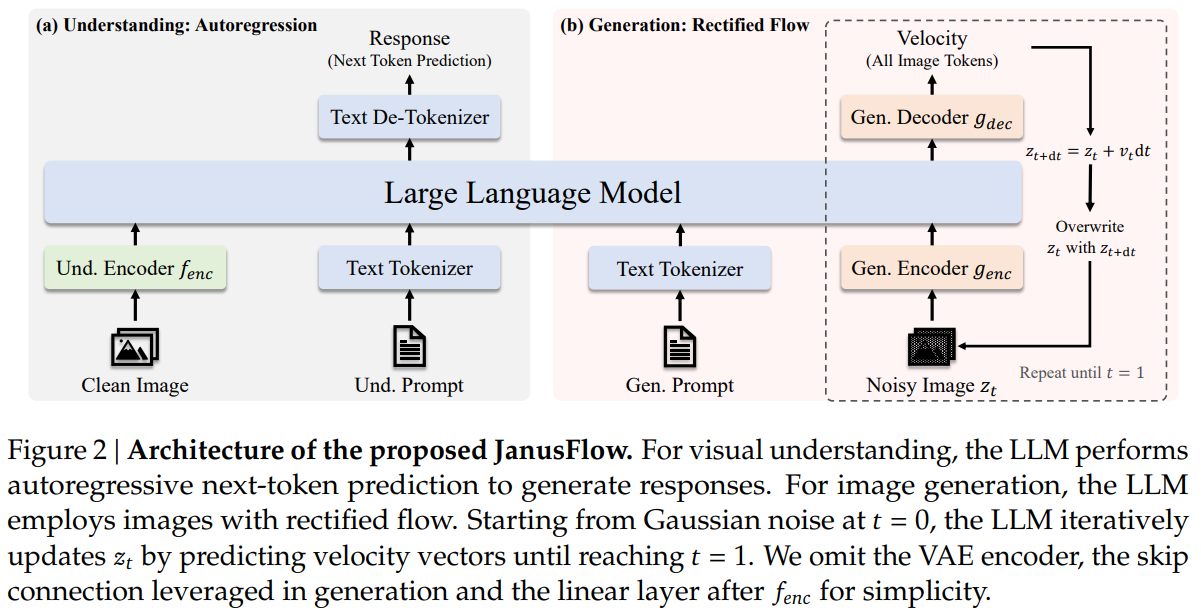JanusFlow는 rectified flow을 LLM 아키텍처와 통합한 멀티모달 모델입니다.