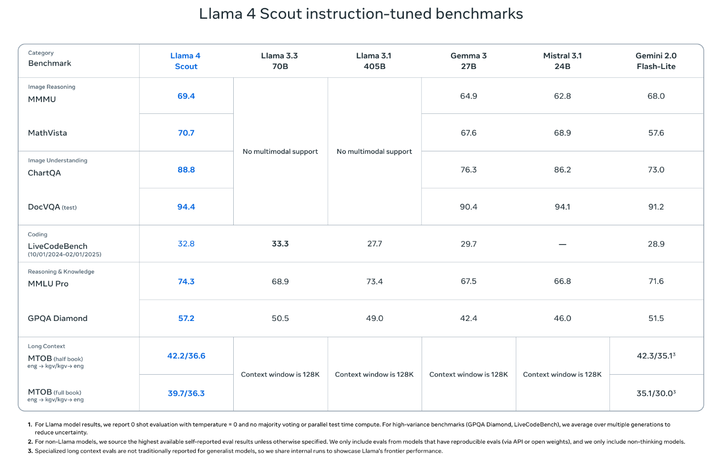 업계 최고 수준인 10M 토큰의 컨텍스트 윈도우를 제공하며 광범위하게 다양한 벤치마크에서 Gemma 3, Gemini 2.0 Flash-Lite, Mistral 3.1보다 뛰어난 성능을 보여줍니다.