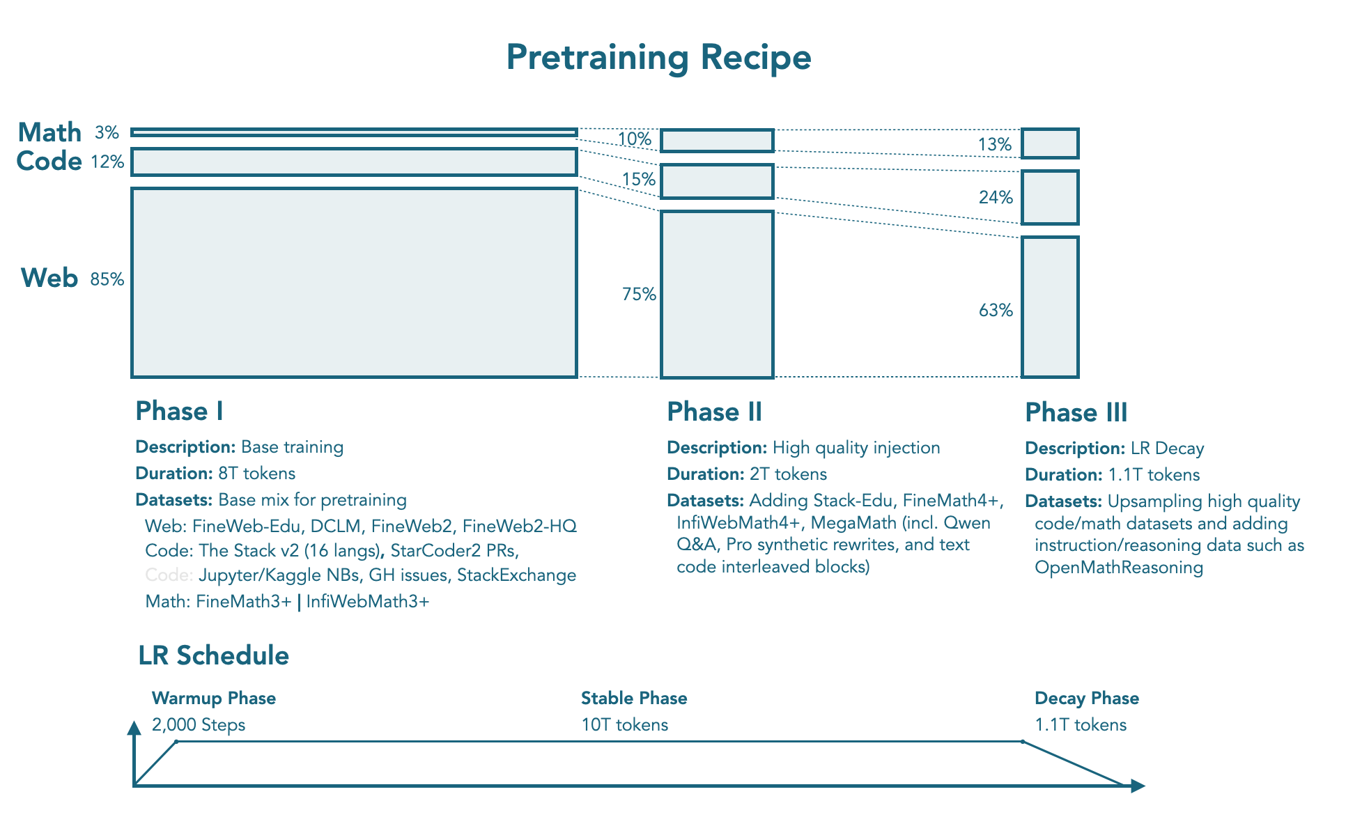 Stage 2: Stable phase (8T → 10T tokens) 좋은 웹 커버리지를 유지하면서 더 높은 품질의 수학 및 코드 데이터셋을 도입합니다: