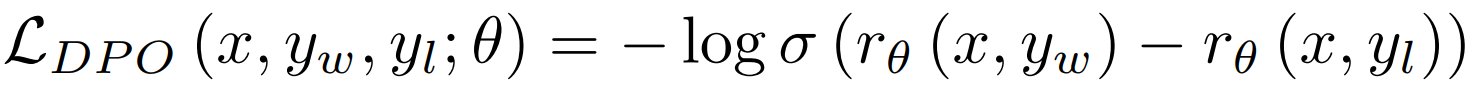 여기서 β는 최적화 중인 모델이 참조 모델에 대해 얼마나 변할 수 있는지를 조절합니다. DPO 손실은 훈련 x, 선택된 y_w 및 거부된 y_l 응답의 삼중체를 최적화합니다:
