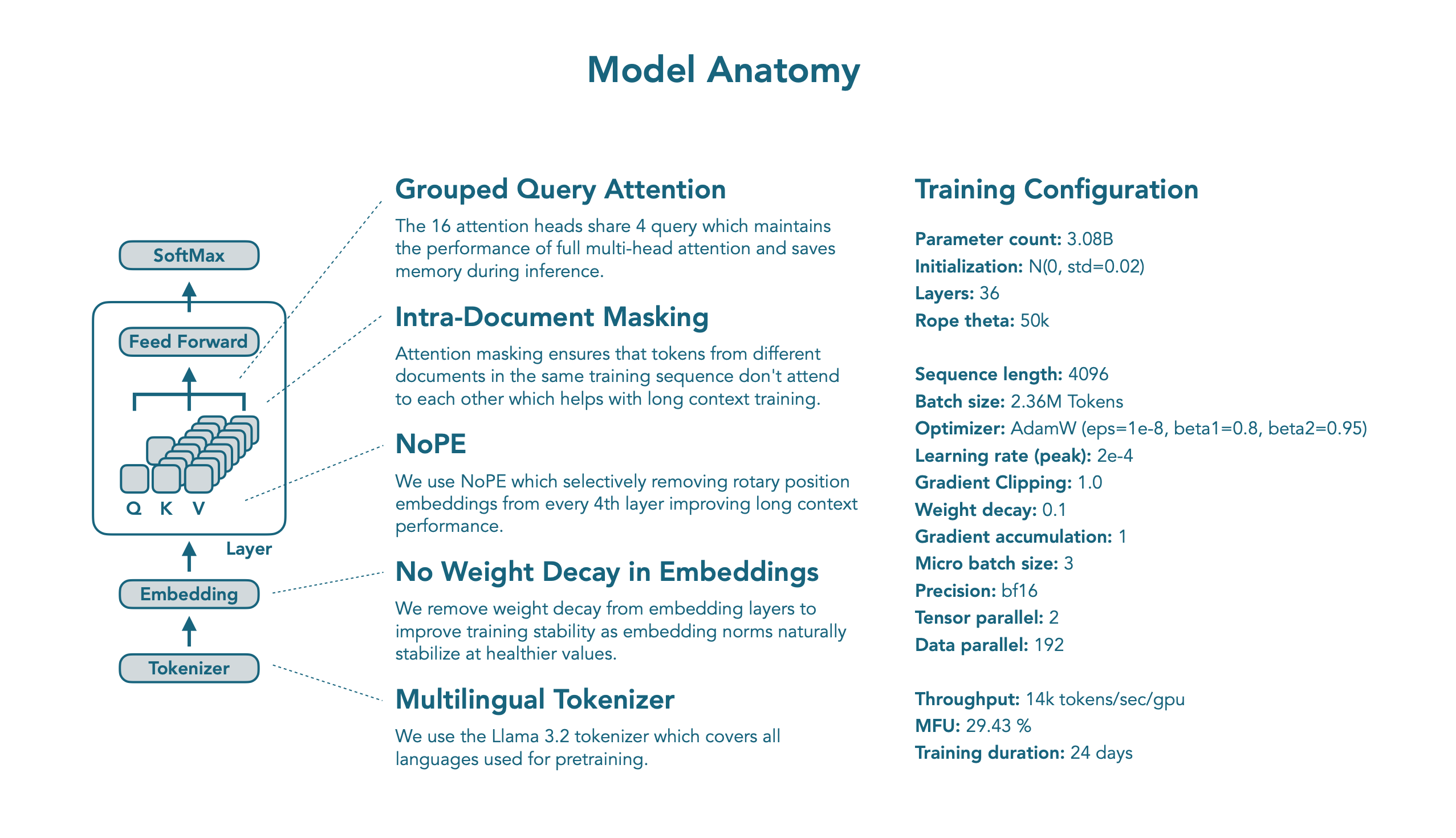 SmolLM3는 SmolLM2와 유사한 연결된 임베딩을 가진 트랜스포머 디코더 아키텍처를 따르며 + Llama 아키텍처를 기반입니다.