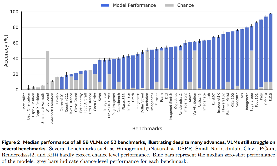 MNIST에서 저조한 성능은 주목할만 한데, 2 layer MLP도 99%의 정확도를 달성하지만 59개의 VLM은 모두 이보다 성능이 낮았습니다.