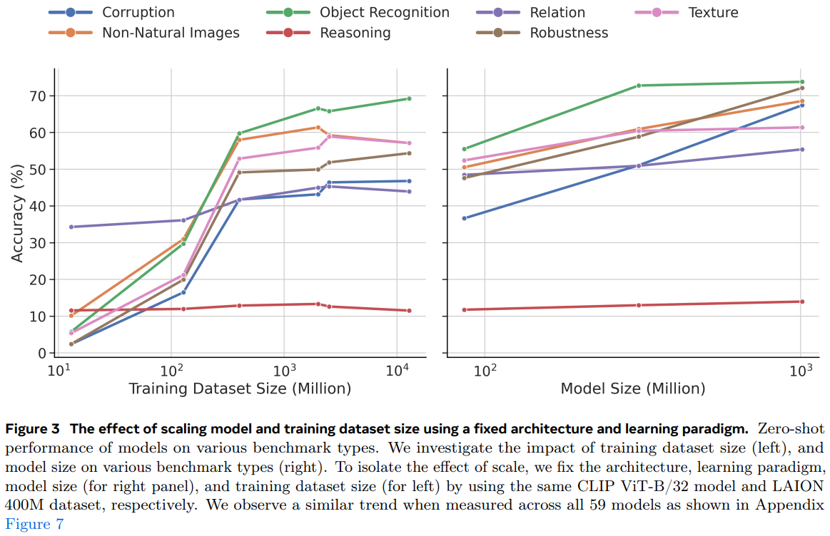 데이터셋 크기의 확장은 많은 작업에서 성능을 향상시키지만 관계 이해와 추론 능력을 평가하는 벤치마크에서는 이러한 경향이 보이지 않습니다.