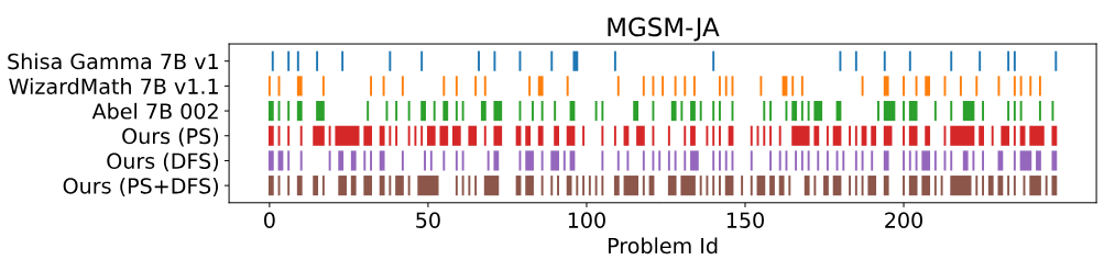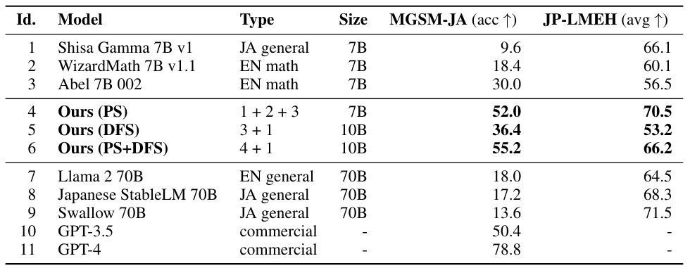 위의 table은 일본어 수학 및 일본어 LLM 벤치마크 작업에 대한 LLM 성능을 요약합니다. 일본어 모델(Id. 1)은 수학 능력 부족하지만 일본어(JP-LMEH)에 대한 이해력이 높습니다. 반대로 수학 모델(Id. 2, 3)은 반대의 결과를 보입니다.