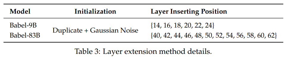 Qwen2.5B-7B 및 Qwen2.5-72B를 활용하여 표 3에 설명된 모델 확장 방법을 사용하여 Babel-9B 및 Babel-83B를 초기화합니다.