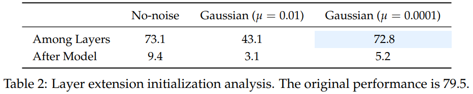 표 2는 다양한 레이어 확장 방법에 대한 초기화 결과를 보여줍니다.