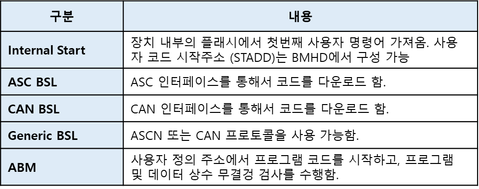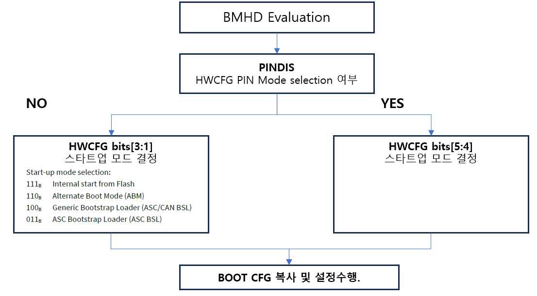Boot Mode Header (BMHD) : 플래시메모리에 존재하는 UCB 영역에 저장된 데이터구조로, 시작주소 , 락스텝 활성화 여부, 외부 부팅모드 활성화 여부등을 선택 할 수 있다.