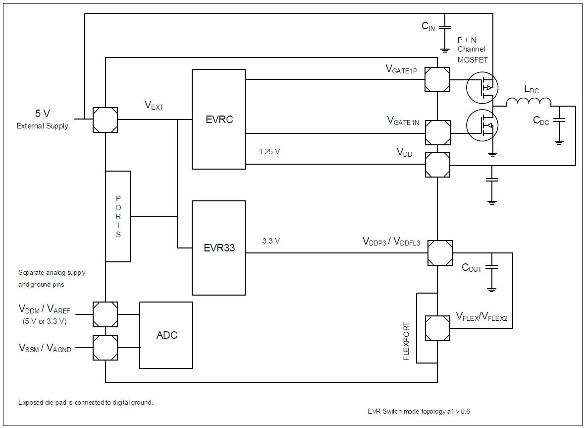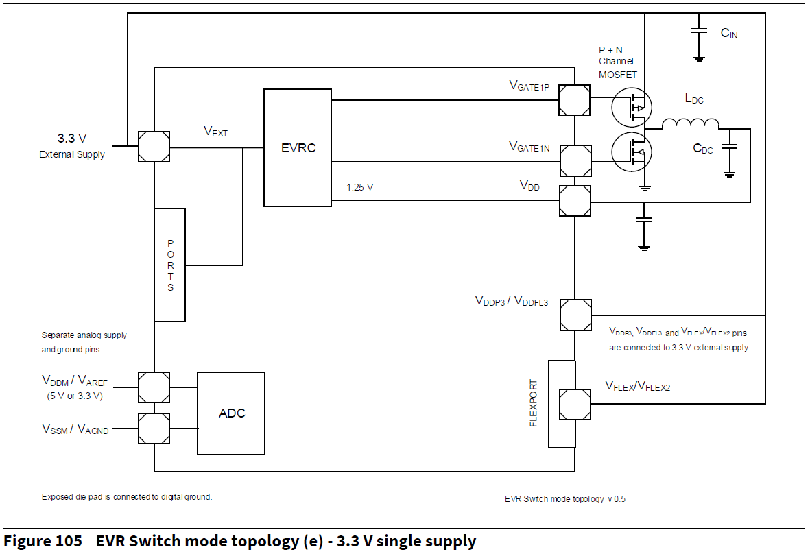 첫번째 케이스는 VEXT핀에 단일 5V 전원을 공급하는 방식이다. VEXT핀에 5V가 공급이 되는 경우 3.3V 전원생성을 위해서는 EVR33을 사용하고, 1.25V VDD 생성을 위해서는 EVRC를 사용한다.