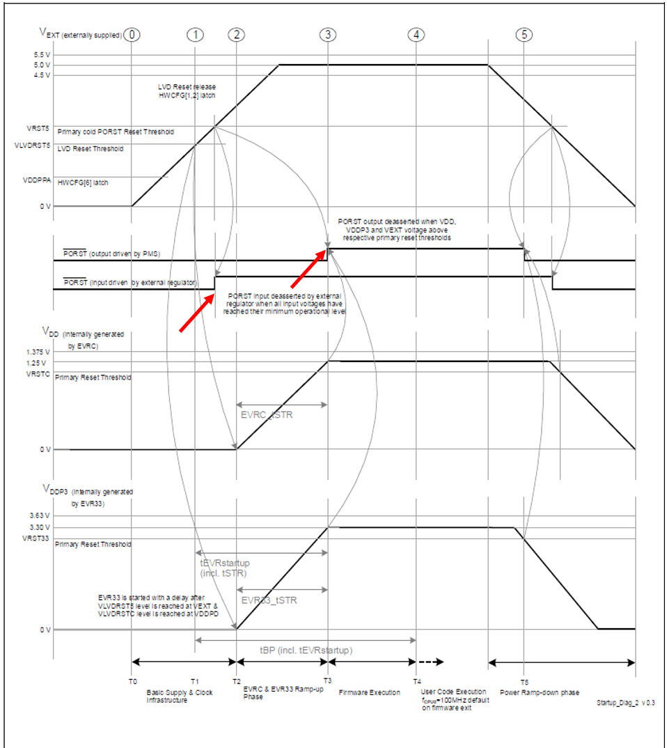 PORST 활성 상태는 입력 또는 출력에서 리셋 신호가 발생한 경우를 의미하는데, PORST INPUT에서 활성화 (LOW Active)가 되는 경우 외부 장치가 PORST 핀 전압을 0V로 유지하여 리셋을 활성화 시키는 경우이며, 일반적으로 외부 전압 VEXT가 임계 전압인 T1 시점까지는 PORST LOW를 유지하는것이 바람직하다. 또한 PORST 출력핀이 있는데, PORST 출력은 마이크로컨트롤러가 내부적으로 리셋을 활성화 해서 PORST 핀을 Low Active로 설정하는것을 외부로 알려주는 경우임. 만약 VEXT 감소에 따라서 내부 주요 전압 Rail (VEXT, VDDP3, VDD)에서 낮은 전압이 감지되면 PORST Low Active Output이 출력된다.