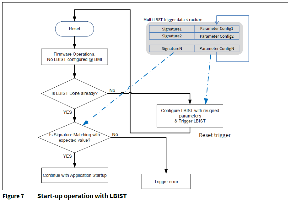 LockStep의 경우 부트펌웨어가 그 초기화 설정을 진행한다. 시작모드 평가중에 유효한 BMI가 발견되는 경우 Lockstep 설정이 진행된다. 만약에 유효한 BMI가 발견되지 않으면 CPU0에 대한 Lockstep이 비활성화 된다. 이말인 즉, 부트모드 헤더에 Lockstep관련 정보가 없으면 CPU0는 Lockstep 모드로 동작하지 않음을 의미한다.