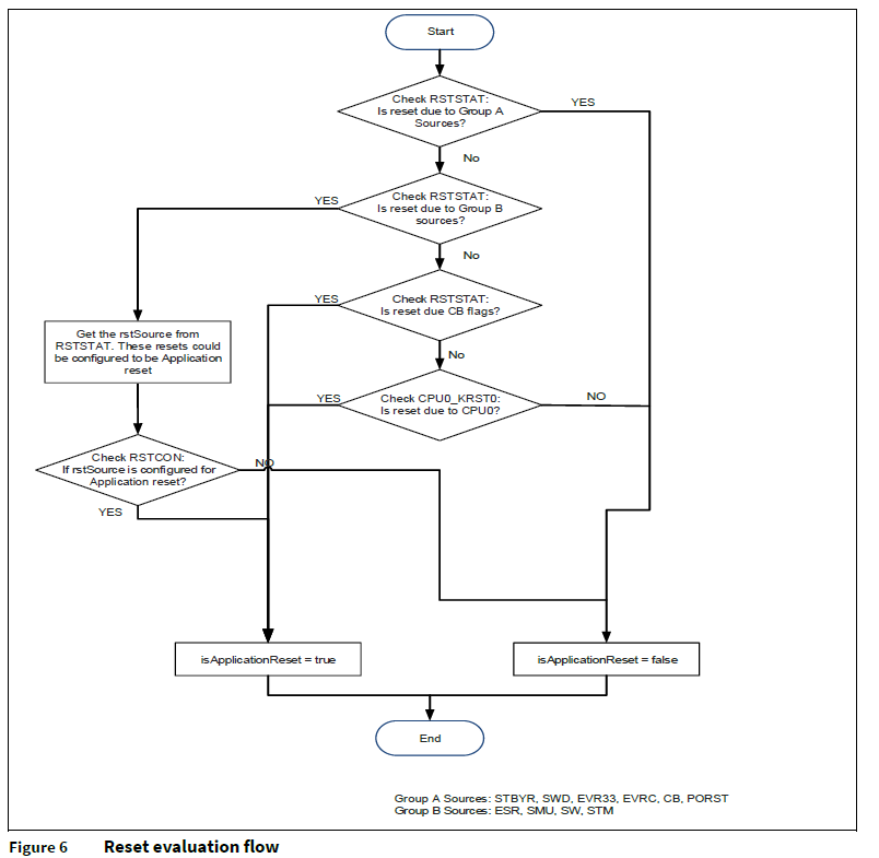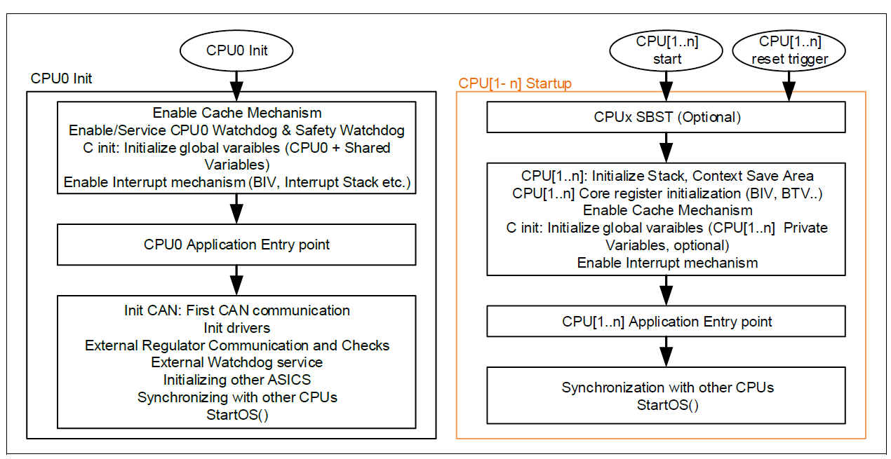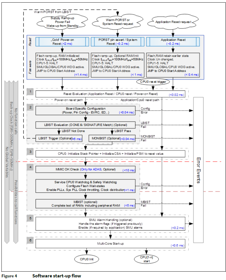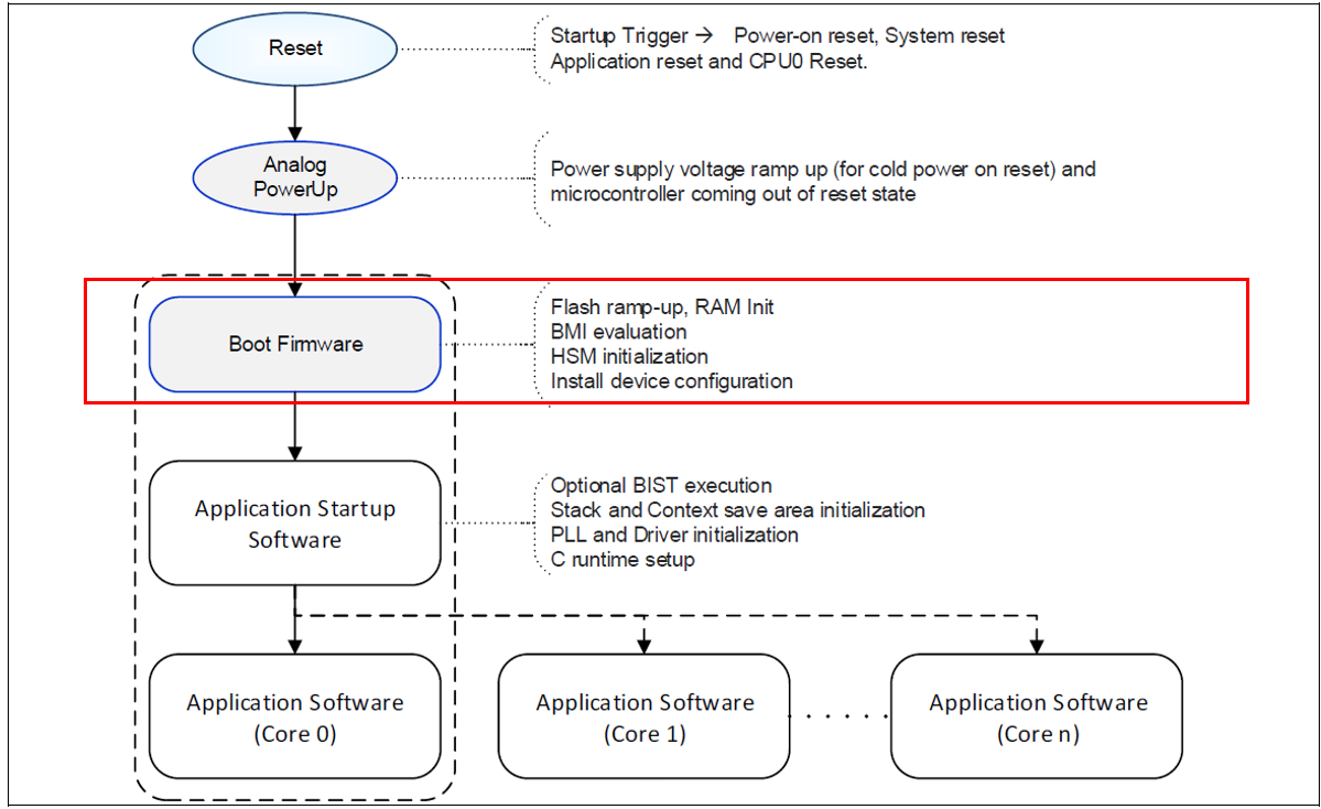 BROM에 존재하는 Boot Code는 아날로그 전원의 Ramp-up이후 PORST 핀의 Reset Assertion, System reset, Application Reset, CPU0 커널 Reset등, 여러 리셋 타입 및 유저의 설정에 따라 다른 스타트업 시퀀스를 갖게 된다.
