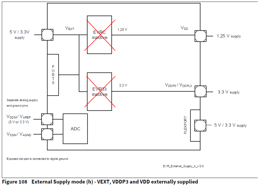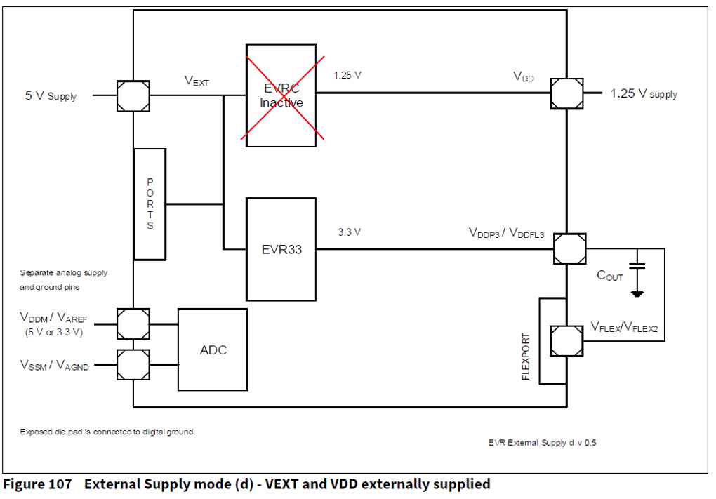 세번째 케이스는 외부에서 5V와 1.25V가 공급되는 경우이다. VEXT는 5V이며, 공급된 5V를 기반으로 EVR33을 사용하여 3.3V가 내부에서 생성된다. 한편 1.25V의 VDD 전원은 외부에서 공급이 되므로, EVRC는 사용되지 않는 Inactive상태가 된다.