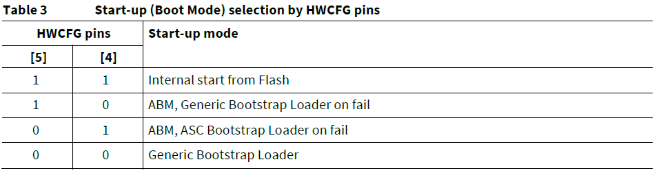 하드웨어 구성핀 (HWCFG PIN) : TC3x 마이크로컨트롤러의 특정 핀을 통해서 부트모드를 설정 할 수 있다. HWCFG핀의 경으 다음 설정을 통해 부트모드를 결정한다.
