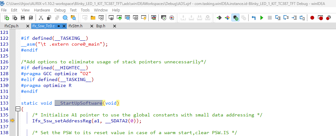 Ifx_Ssw_C_Init();: C 런타임 변수를 초기화한다. 전역 변수 초기화, 메모리 영역 초기화 등 C 런타임 환경을 설정하는 데 필요한 작업을 수행한다.