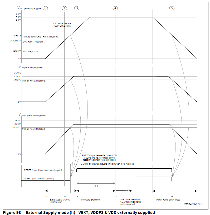 앞서 Tricore의 외부 전원 공급 방식에 대해 간략히 살펴보았다. 그러면 본 절에서는 전원이 공급되는 방식에 따라서 상세하게 Power-Up Sequence가 이뤄지는 내용을 다뤄보도록 한다. 전원이 공급되는 방식에 따라 일부 상이한점이 있긴 하나, 전체적으로 Power-Up Sequence는 유사하게 구성되어있으며 대동소이한 수준이다. 따라서 위 사례 중 5V가 단일 전원 공급되는 사례와, 모든 전원이 외부에서 공급되는 두가지 사례만을 User Manual에서 발췌하여 설명해보도록 한다.