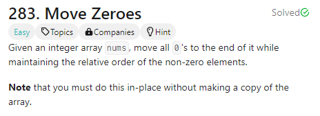 숫자 배열이 주어지면, 0을 제외한 수들의 상대적인 순서를 유지한 채로 모든 0을 배열의 끝으로 옮기는 문제이다