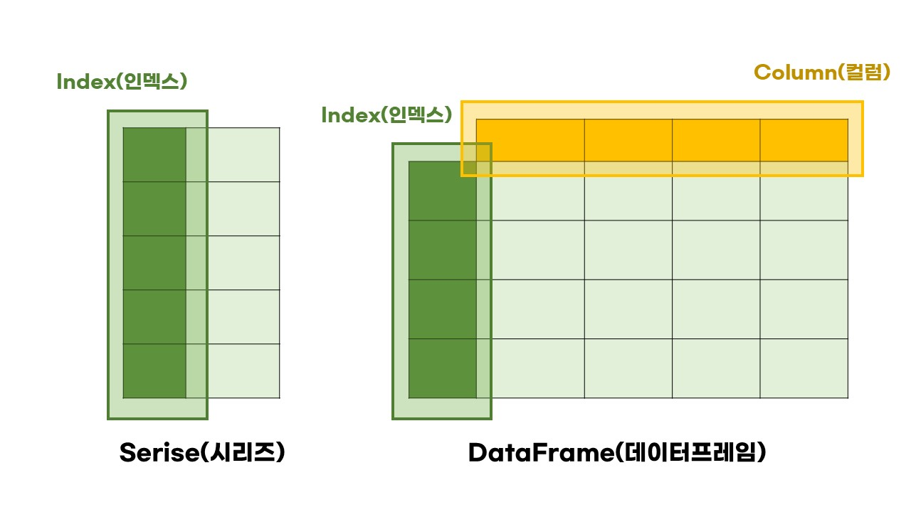 시리즈 데이터가 여러 개 모여서 표와 같은 2차원 구조를 갖는 것이다. 이 데이터프레임은 판다스가 데이터를 분석할 때 사용하는 기본적 틀이다.