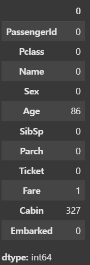 test data에는 Age, Fare, Cabin 컬럼에 결측치가 존재