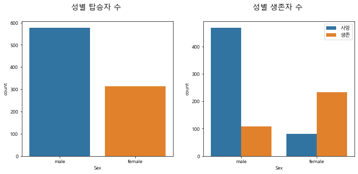 axes[0].set_title("성별 탑승자 수 \n", size=15)