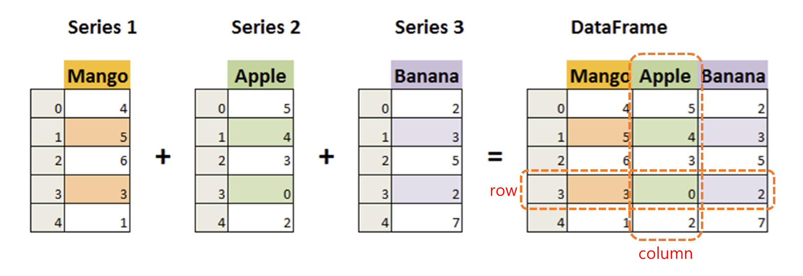 하나의 데이터 프레임은 행과 열로 구분할 수 있는데, 하나의 행은 여러 종류의 데이터를 담고 있다. 모든 행은 동일한 형태의 자료 배치를 가진다. 그리고 각 열은 동일한 자료형을 가진 시리즈임을 알 수 있다.