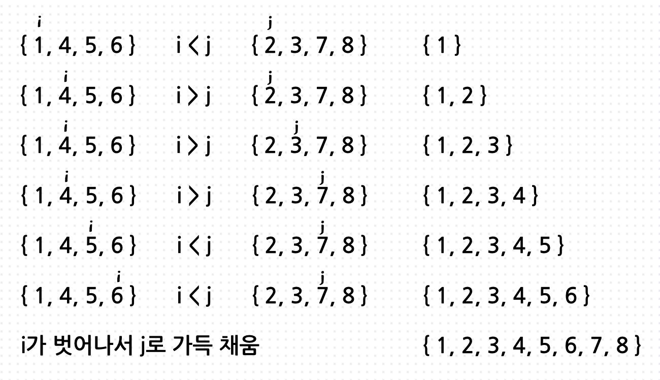2. i랑 j를 계속 이동하면서 작은 원소를 정렬할 배열에 넣습니다.