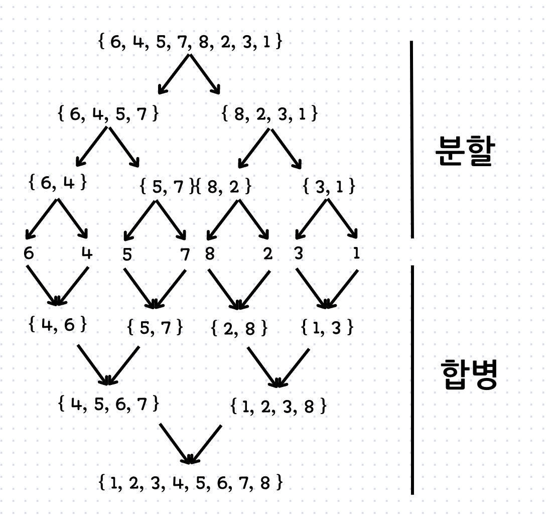 분할: 입력 배열을 같은 크기의 2개의 부분 배열로 분할합니다.