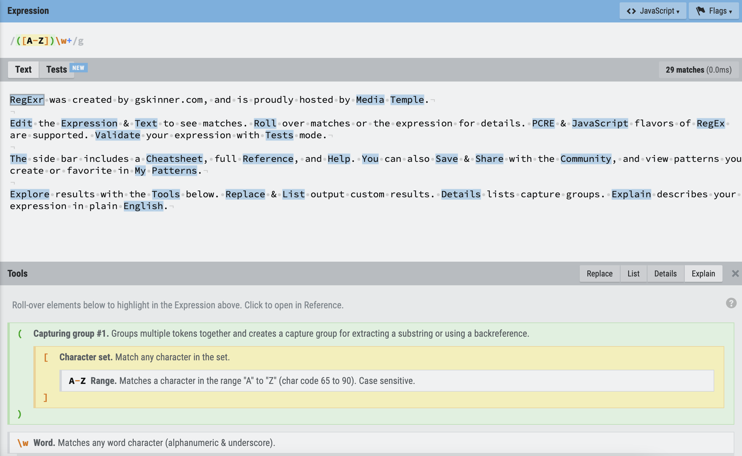 MDN https://developer.mozilla.org/en-US/docs/Web/JavaScript/Guide/Regular_Expressions