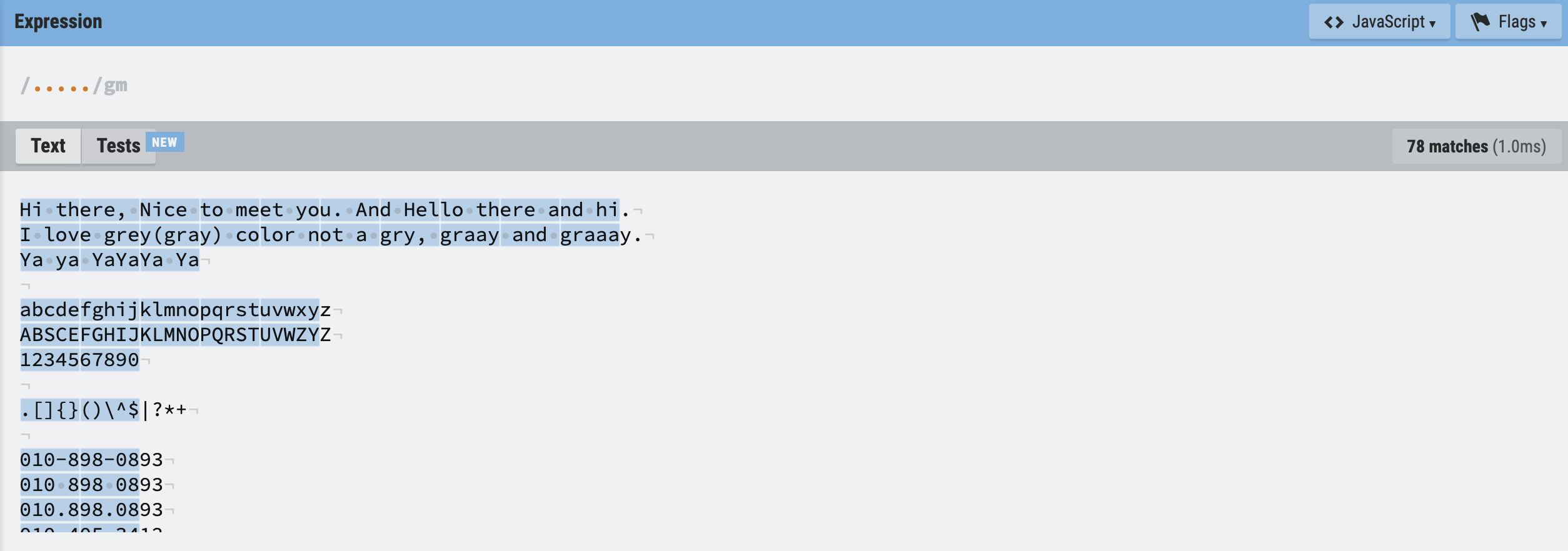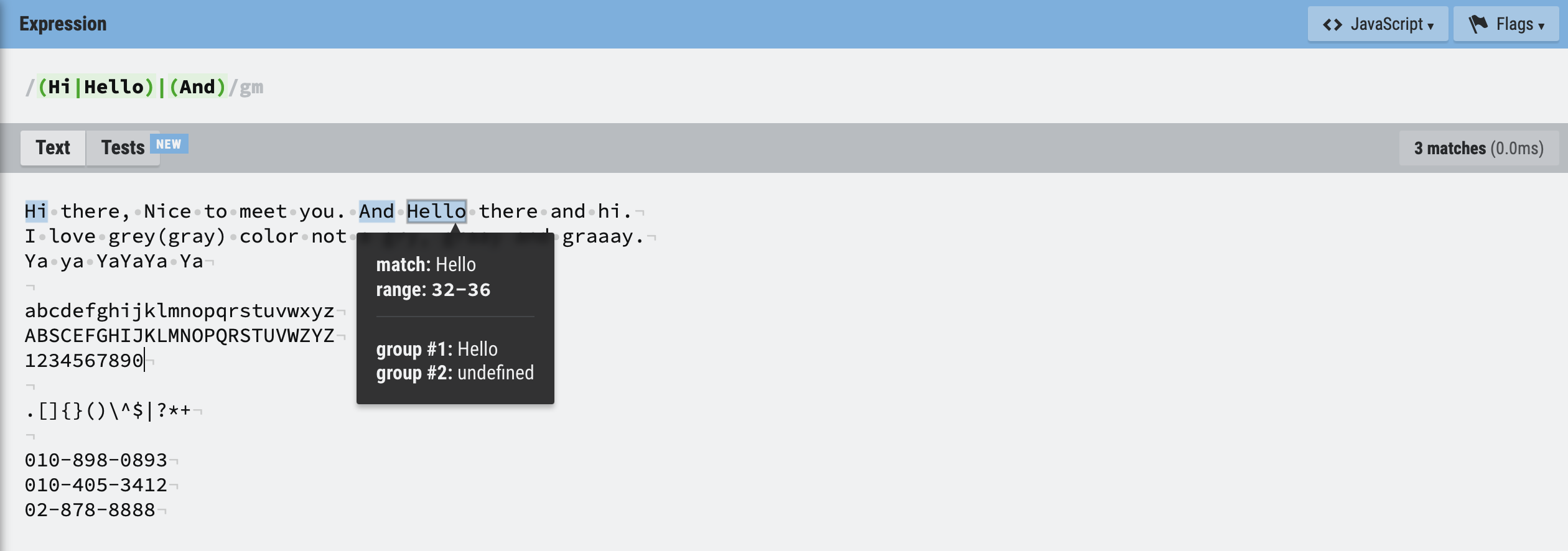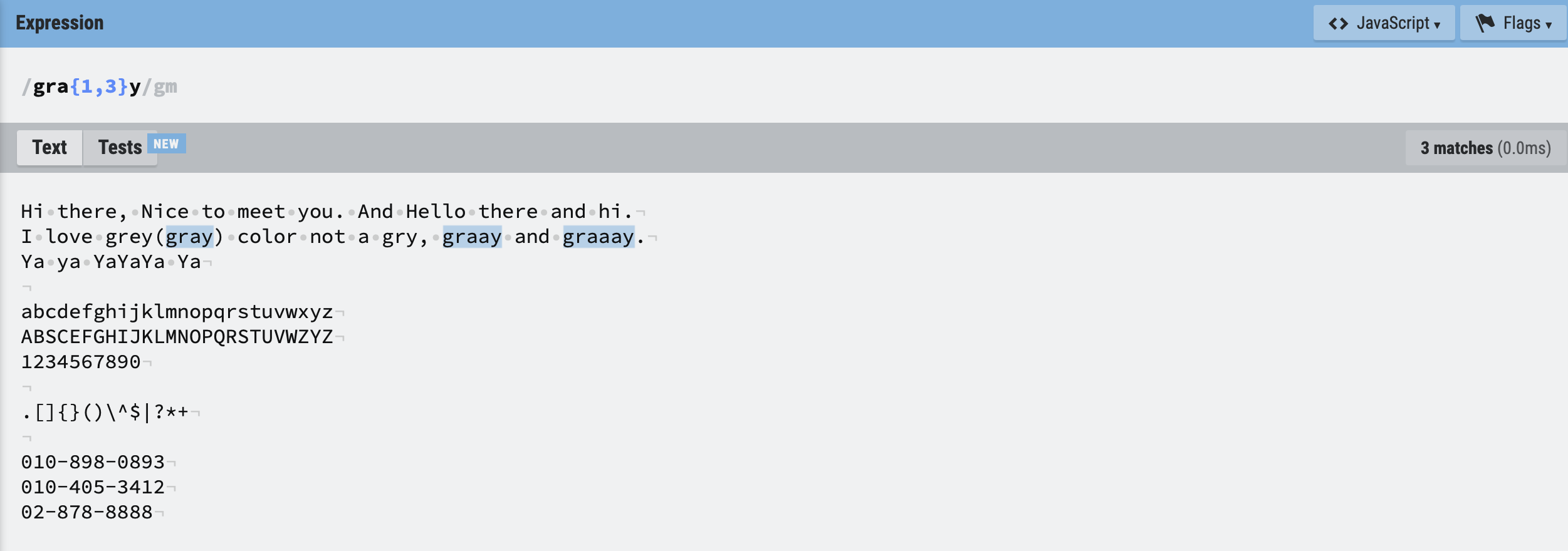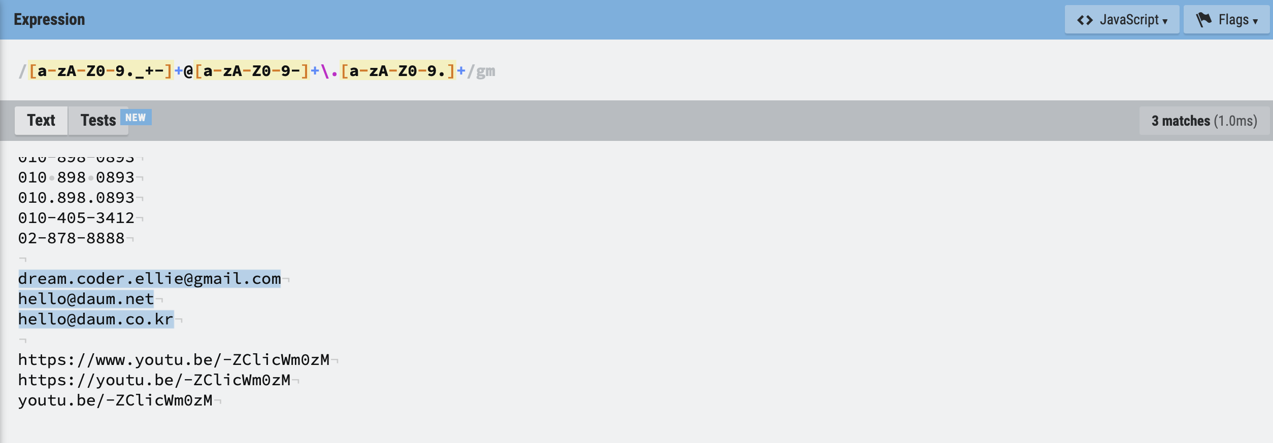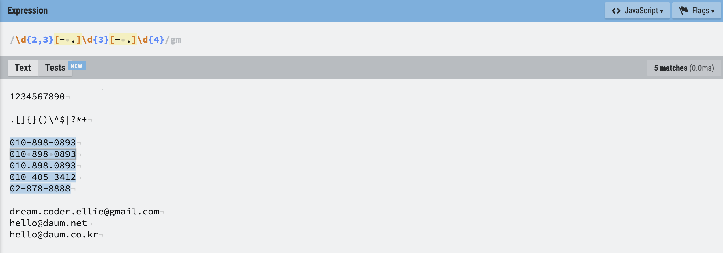 -, ., 으로 연결됨)/\d{2,3}[- .]\d{3}[- .]\d{4}/gm