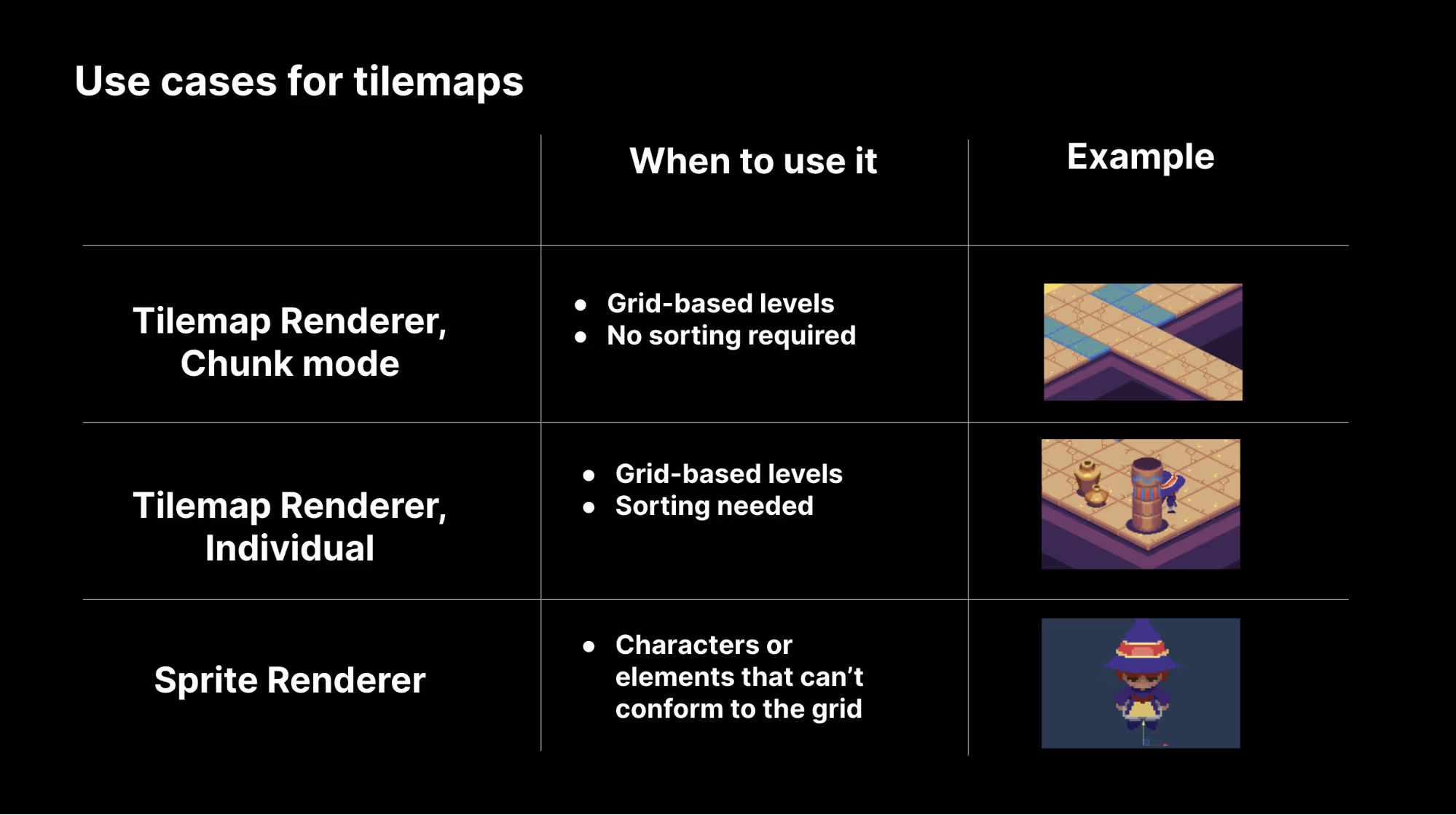 - 단일 레이어로 고정된 맵이나 소팅이 거의 필요 없는 레벨 아트에 적합합니다.