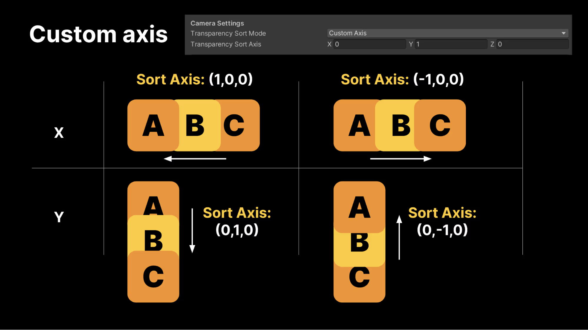 - 직접 축을 지정해 해당 축에 따른 오브젝트의 좌표를 기준으로 투명 순서를 정합니다.
