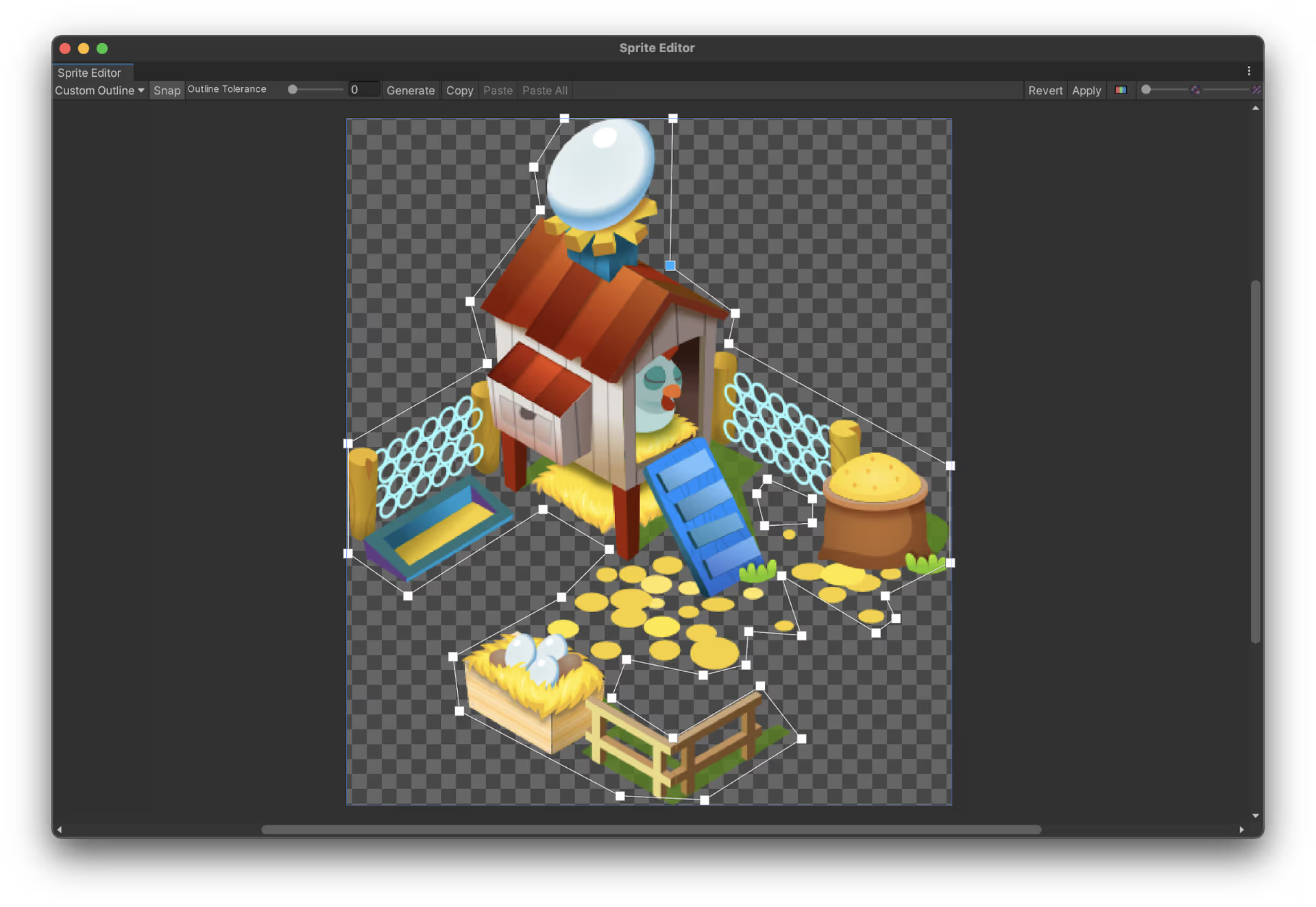 - 스프라이트 편집기에서 Custom Outline을 사용하면 스프라이트 주변의 메시 형태를 좀 더 정교하게 다듬을 수 있습니다. 이를 사용하여 실제로 그려야 하는 부분만 렌더링 하도록 조정합니다.