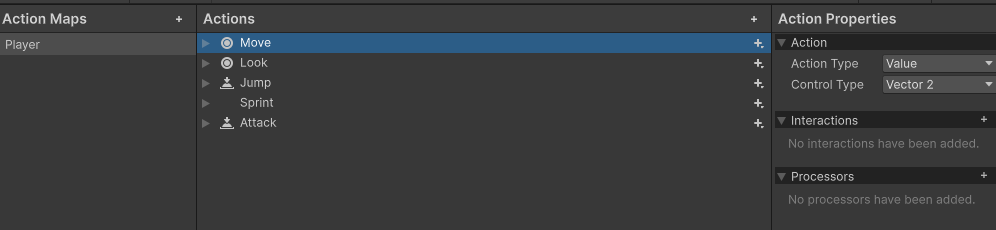- Actions : 입력 동작(행위)을 정의 (특정 입력에 대한 이벤트 Move, Attack, Jump ...)