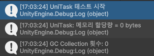 Debug.Log($"UniTask: 메모리 할당량 = {memoryAfter - memoryBefore} bytes");