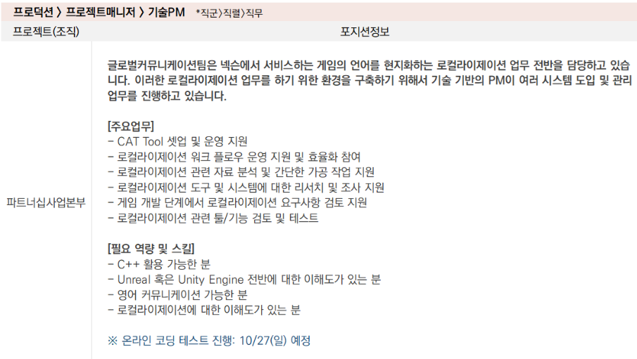 보통 기술PM이라고 하면 기술적 지식을 활용해 프로젝트 관리를 하는 비개발 직무라고 생각하는데, 특이하게도 코딩테스트가 전형 내에 있었다. 그래도 나름 알고리즘 문제들도 풀어봤고, 로컬라이제이션이라는 분야에도 관심이 생겨 해당 파트로 지원했다. 마침 주 프로그래밍 언어가 C++이었고, 언리얼엔진으로 게임을 개발하는 등 게임 엔진에 대한 이해도가 있는 편이었다.