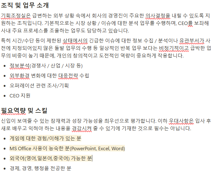 앞서 말했듯이, 넥슨코리아에만 지원하는 것보다 다른 법인에도 지원해보고자 넥슨게임즈에도 지원해봤다. 이번에는 완전 경영 파트였다. 개발직을 해볼까도 생각했지만, 해당 공고를 보니 흥미가 생기기 시작했다.
