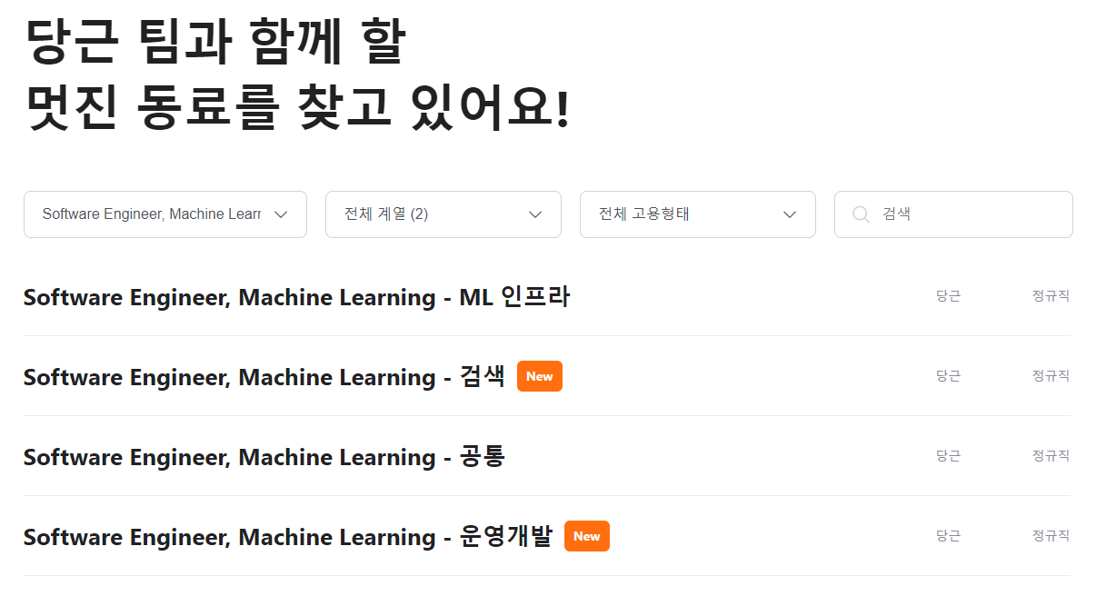 중고거래 플랫폼을 시작으로 인지도를 얻은 기업으로, 추천 시스템 및 검색 분야 등에서 AI를 접목한다고 한다. 특화된 기계학습 모델을 개발하기는 하지만, 직접적으로 LLM 모델을 개발할 정도로 규모 및 리소스는 충분하지 않아 주로 빅테크에서 개발한 모델을 파인튜닝하는 쪽에 가깝다는 설명이다. 당근 채용사이트에 현재 모집중인 직군과 기대역량, 그리고 채용절차가 설명되어있다.