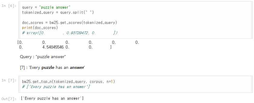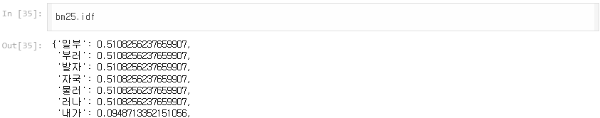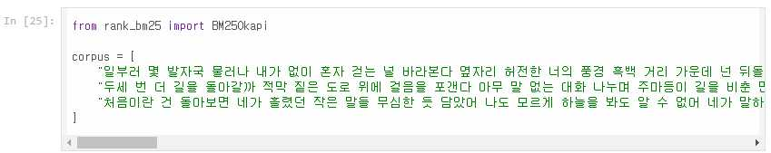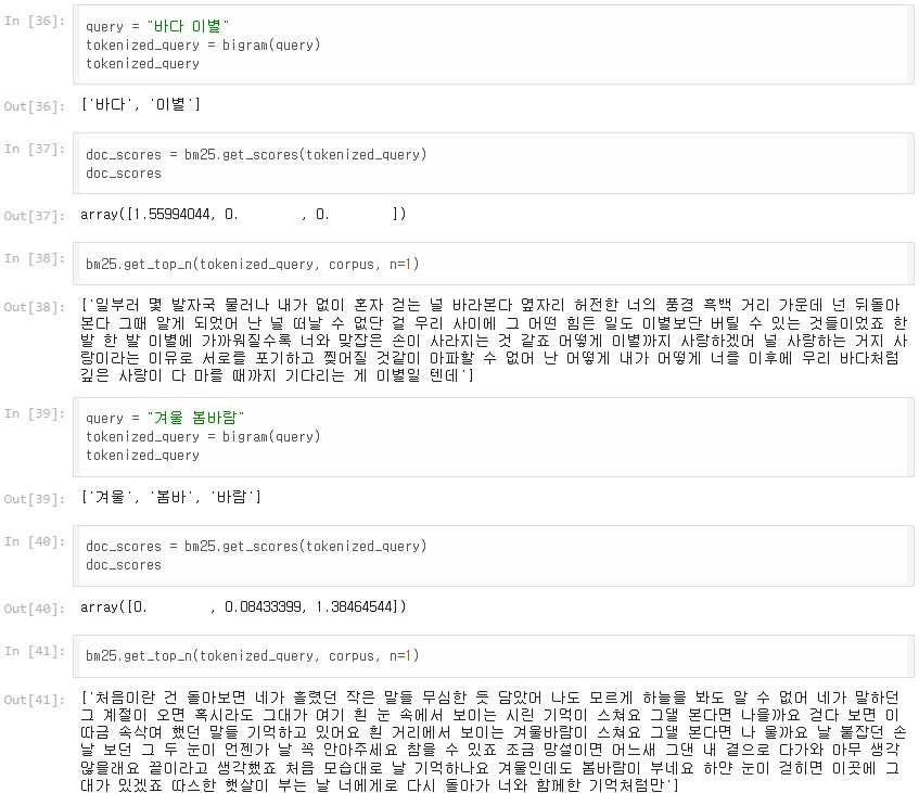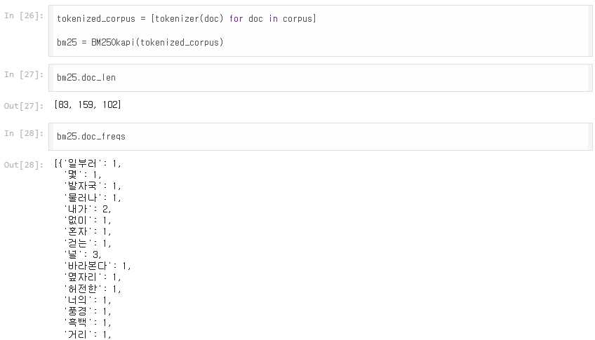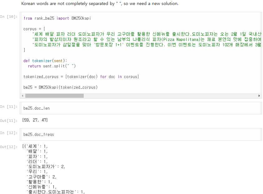 다음은 한국어 문서에 BM25 모델을 적용하는 예제다.