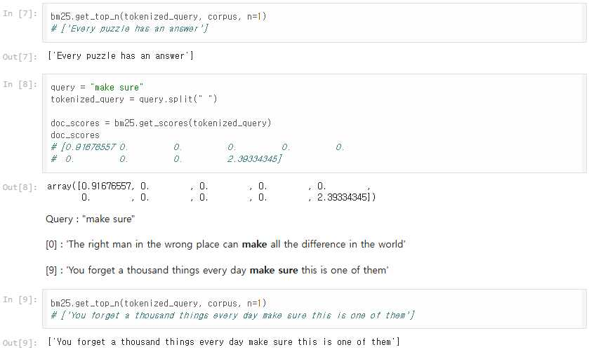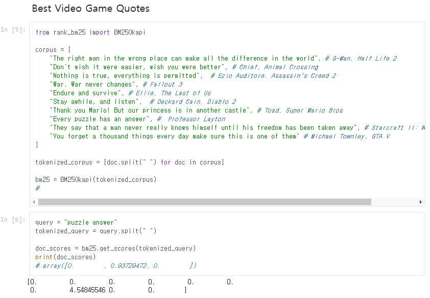 따라서 쿼리와 더 연관성이 있는 문서는 index = 9의 ‘GTA 5’의 명대사이며, BM25 점수도 더 높다.