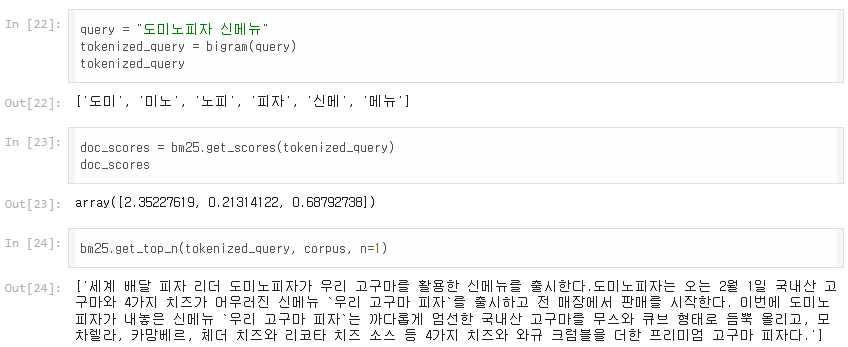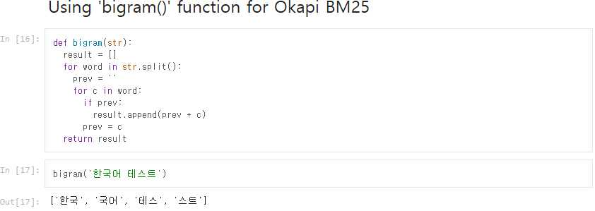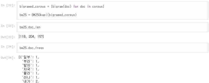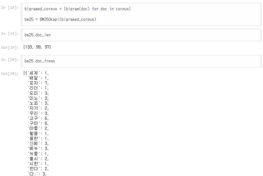다음은 예시로 주어진 corpus에 대해 bigram() 함수를 적용해 BM25 랭킹을 진행하는 과정과 그 결과다.
