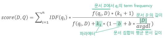 파라미터 b는 문서의 길이의 중요도를 조절하는 값으로, 보통 0.75로 설정한다.