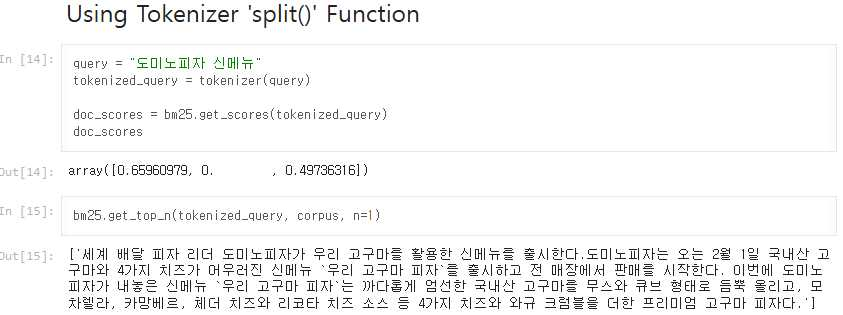 영문서에서 토큰화 과정을 거친 것처럼 한국어 문서에서도 띄어쓰기를 이용해 토큰화한 후 BM25 모델로 랭킹 점수를 측정해보자.