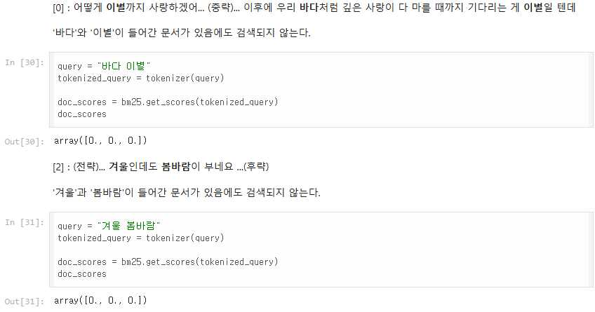가령 쿼리가 “바다 이별”일 때, AKMU의 노래에는 이 두 단어가 모두 있지만, 조사와 함께 토큰화가 되어있어 쿼리의 두 단어만으로는 검색이 이루어지지 않는다.