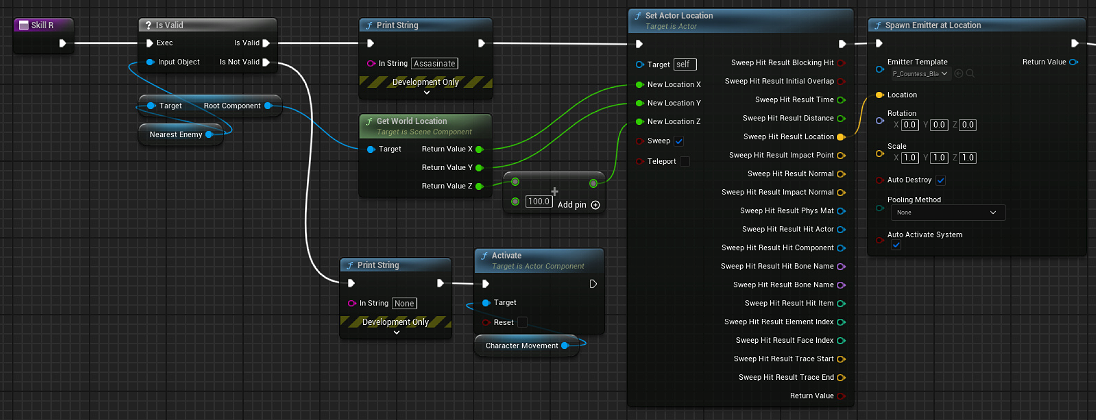 Skill_R 함수로 오면 우선 '설정된 대상'이 있는지부터 확인한다. 있다면 타겟의 위치로 이동한다. 날아가서 내리찍는 형태기 때문에 Z 좌표에 1미터만큼 값을 더했다. '위치에서 이미터 생성' 노드는 스킬에 사용되는 파티클을 보여주는 것이다.
