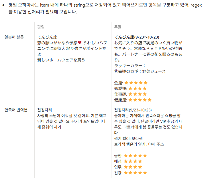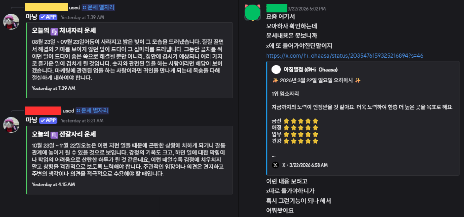 마냥이로도 다음과 같이 운세를 가져올 수 있는데, 아침별점 X 계정과는 내용도 포맷도 많이 달라, 이 내용을 그대로 가져올 수 있냐는 문의들과 사용자 행동들이 있었다.
