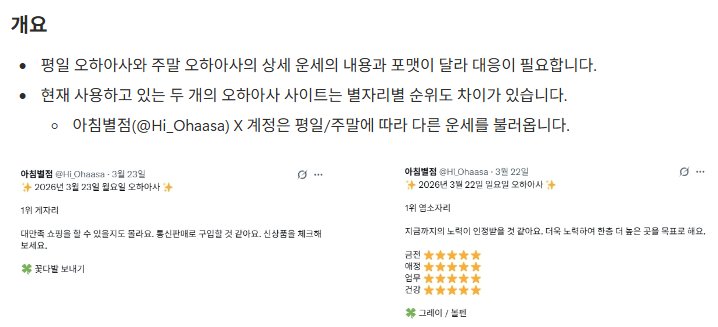 우선 레퍼런스인 마냥이와 아침별점(@Hi_Ohaasa)의 구조를 참고하되,