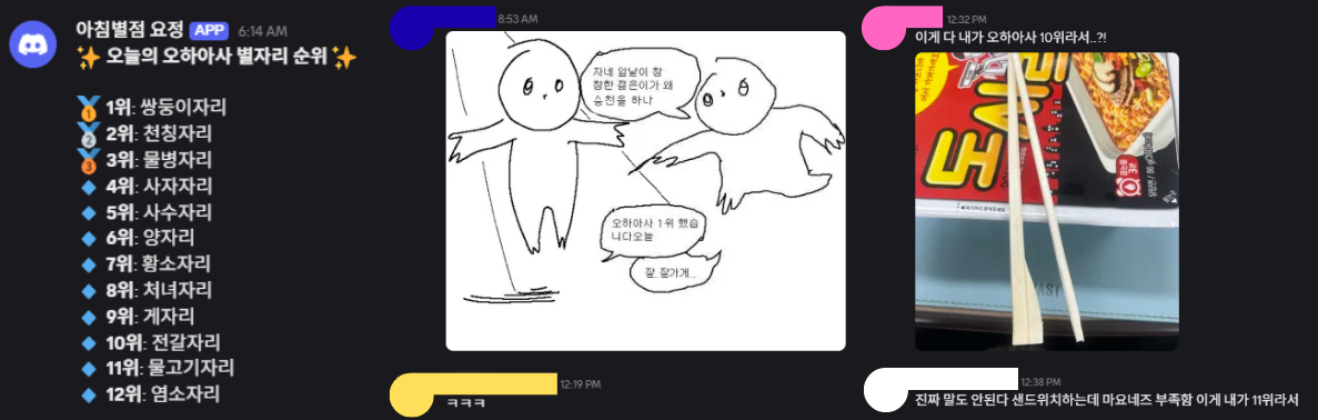 약 40명 규모의 친목 디스코드 서버에서는 이제 특정 채팅 채널에서 오하아사 순위를 확인하고, 이에 대해 리액션을 하는 것이 자리잡았다.