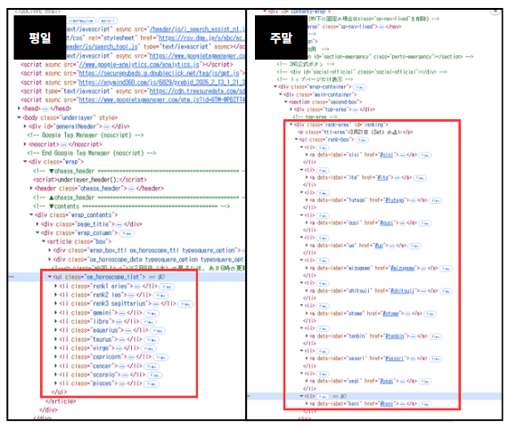 심지어 두 사이트의 구조와 리스트 아이템의 이름이 달랐다. 평일 사이트는 영어 학명인 데에 비해, 주말 사이트는 일본어 영어 표기로 작성되어 있었다.