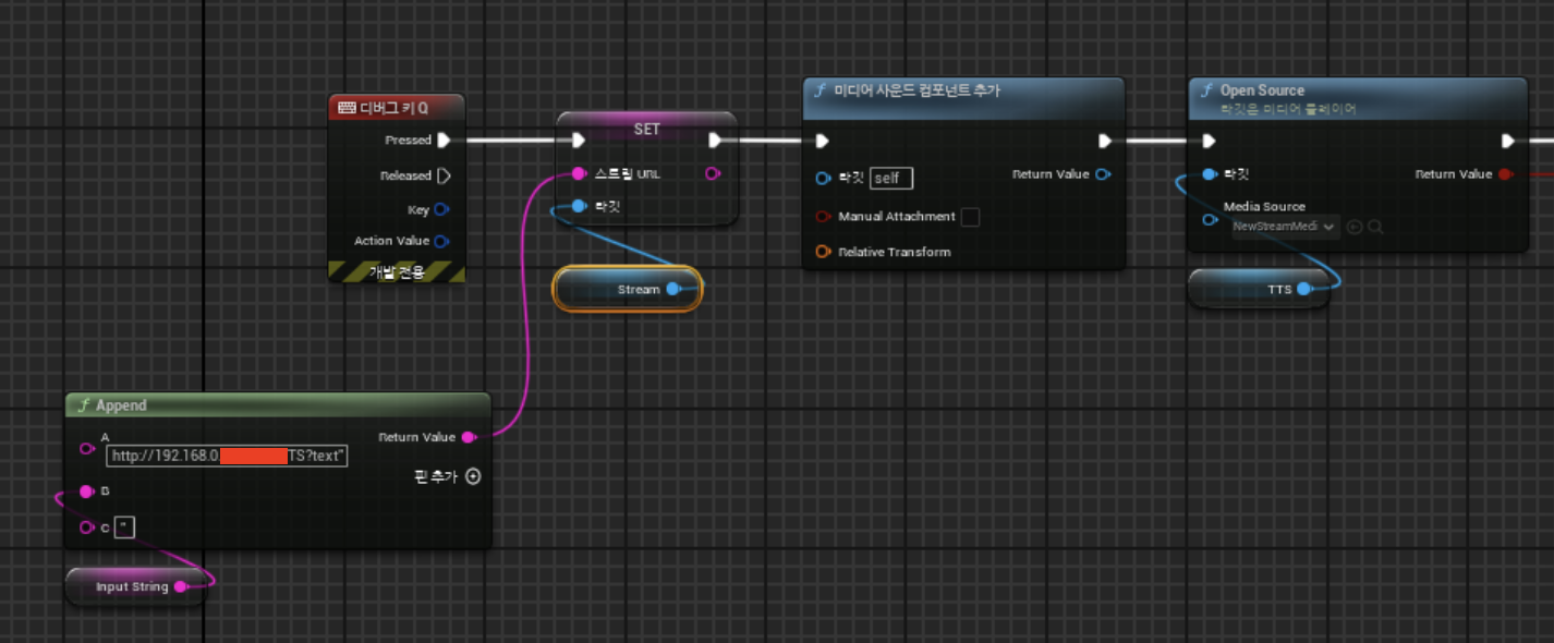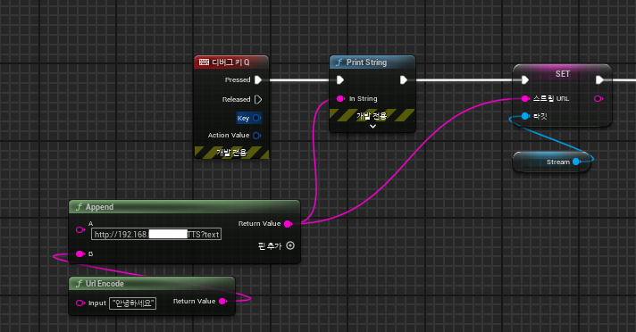 TTS로 출력할 문자열을 Url Encode 함수를 통해 퍼센트 인코딩을 진행한 후, 이를 로컬 서버 주소와 연결하면 정상적으로 한국어 TTS가 언리얼엔진에서 재생된다.